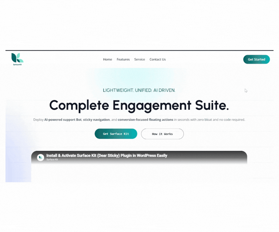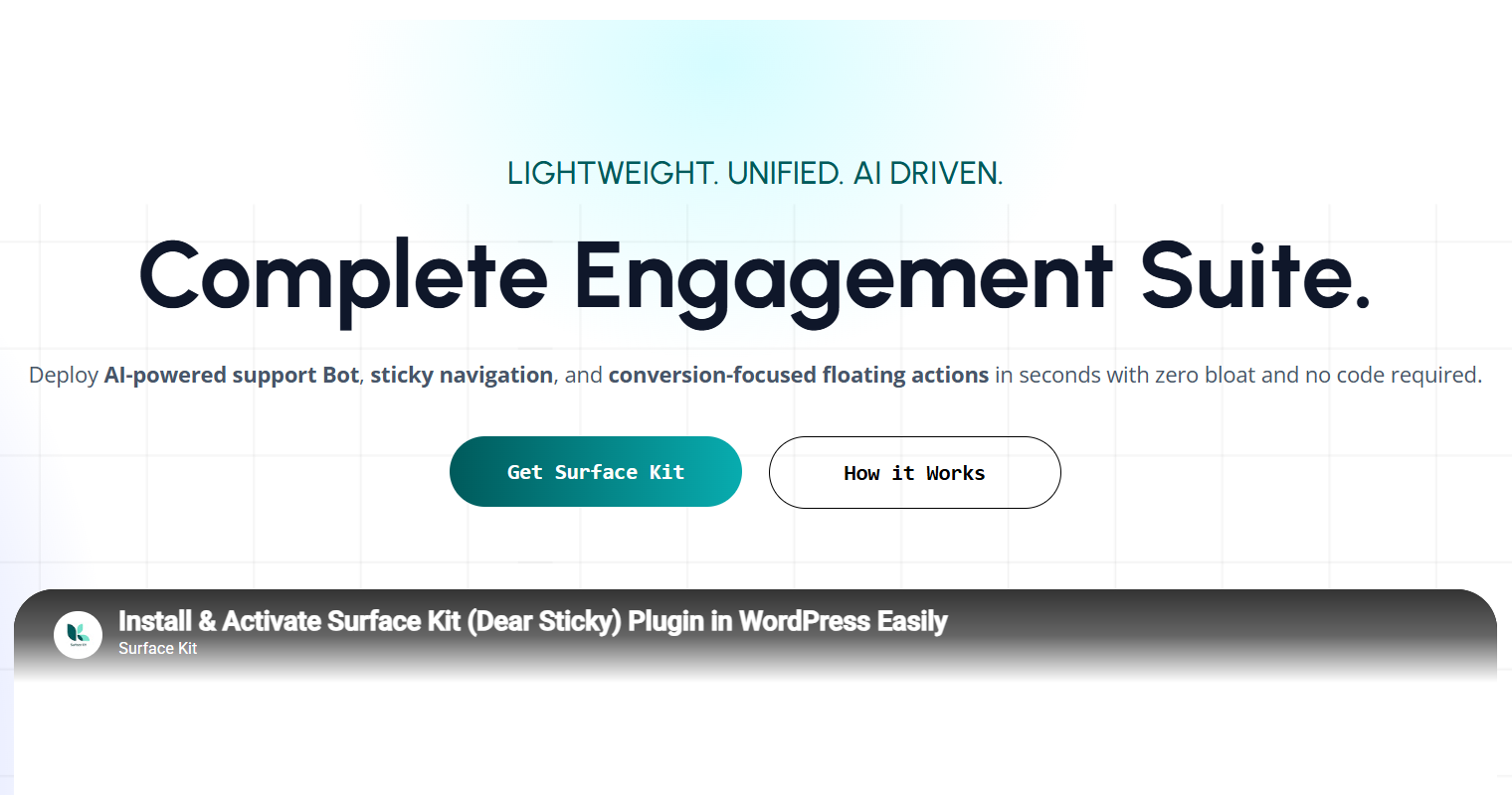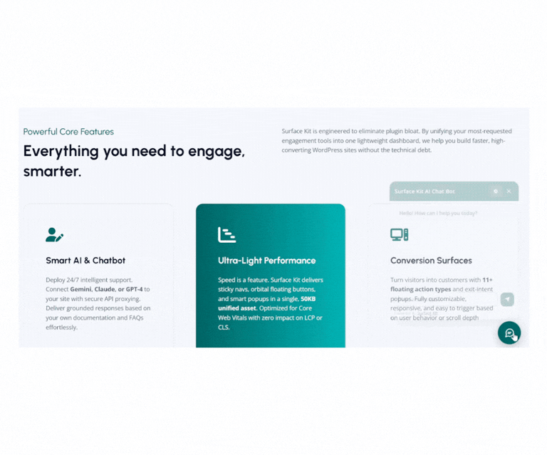 Surface Kit is engineered to eliminate plugin bloat. By unifying your most-requested engagement tools into one lightweight dashboard, we help you build faster, high-converting WordPress sites without the technical debt.