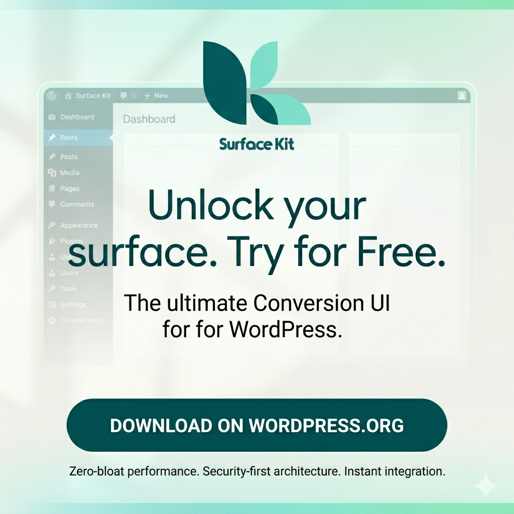 You can install Surface Kit directly from the WordPress Plugin Repository. Once activated, visit the Surface Kit Dashboard in your sidebar to toggle only the features you need. Our “Modular Core” ensures that if a feature is off, its code never loads on your site.
