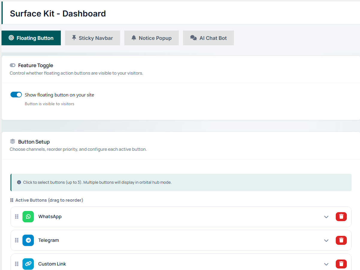 Meet your customers where they are. Surface Kit allows you to add floating buttons that connect visitors directly to your WhatsApp or other support channels. It’s the fastest way to turn a casual browser into a direct lead.